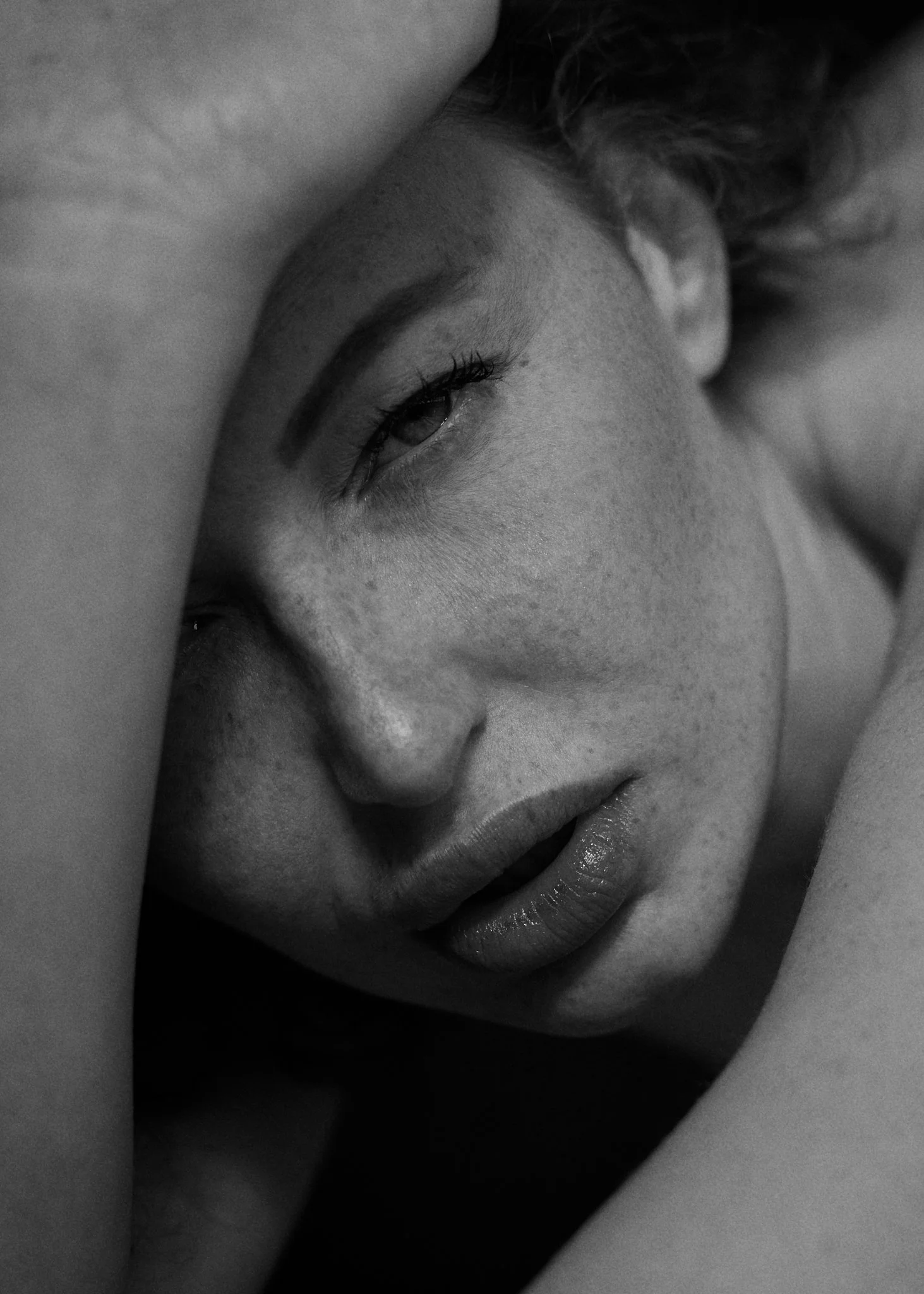 Schwarzweiß-Fotografie eines nahen Porträts eines Menschengesichts mit geschlossenen Augen, leicht geöffnetem Mund und Armen über dem Kopf.