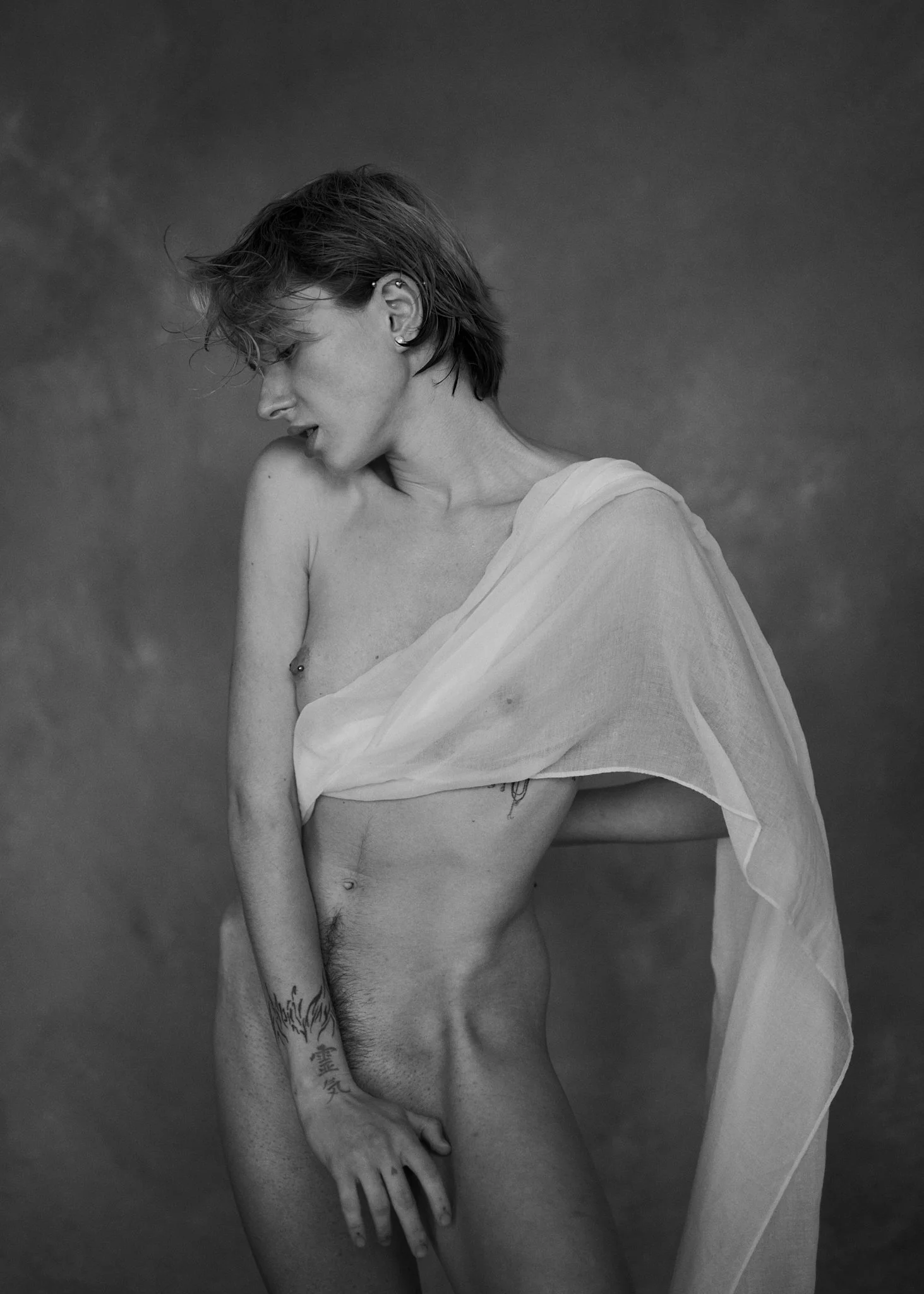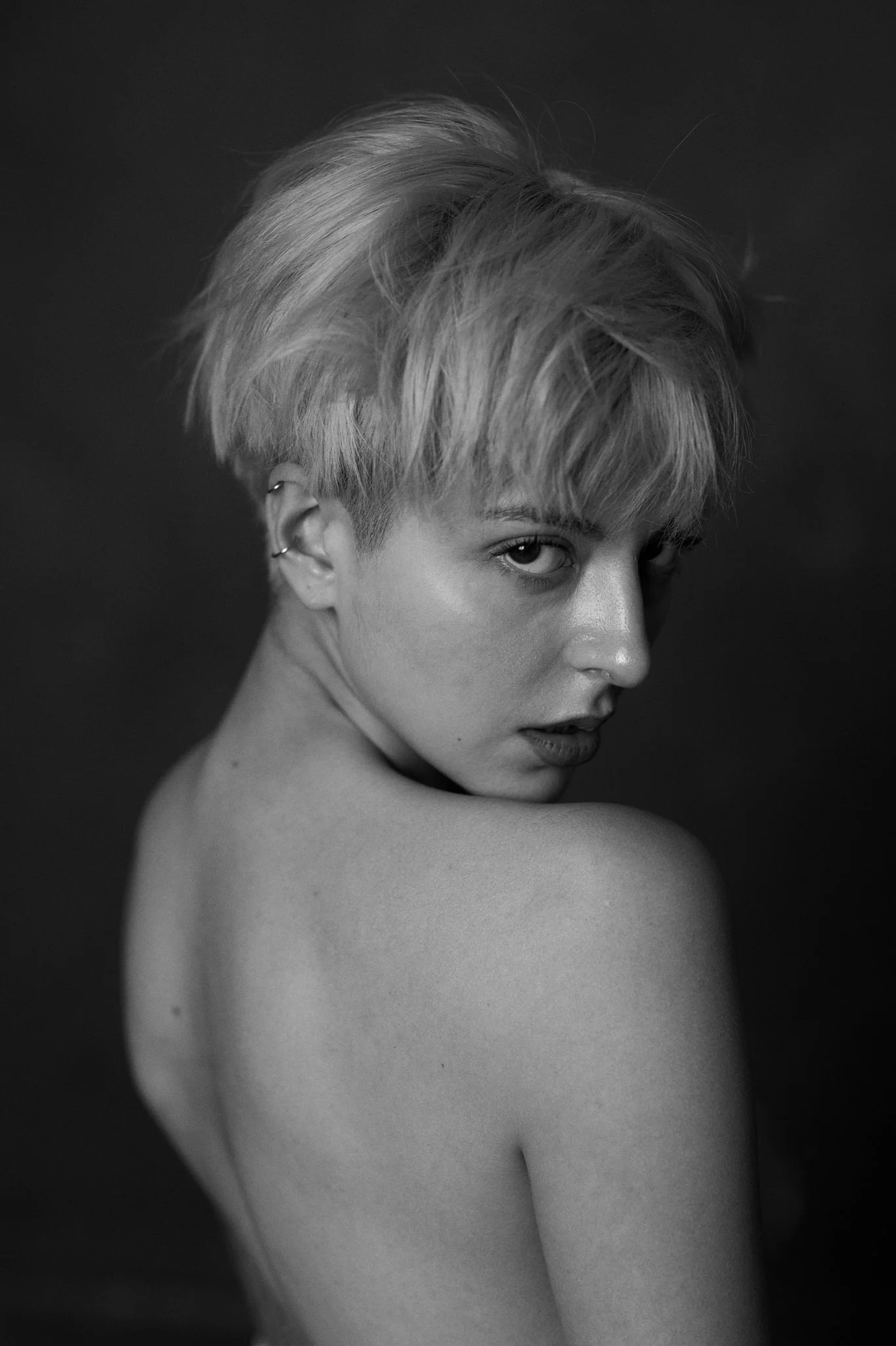 Schwarz-weiß-Fotografie eines jungen Menschen mit kurzer, lockerer Frisur und Piercings am Ohr, der Schulter nackt, blickt über die Schulter in die Kamera.