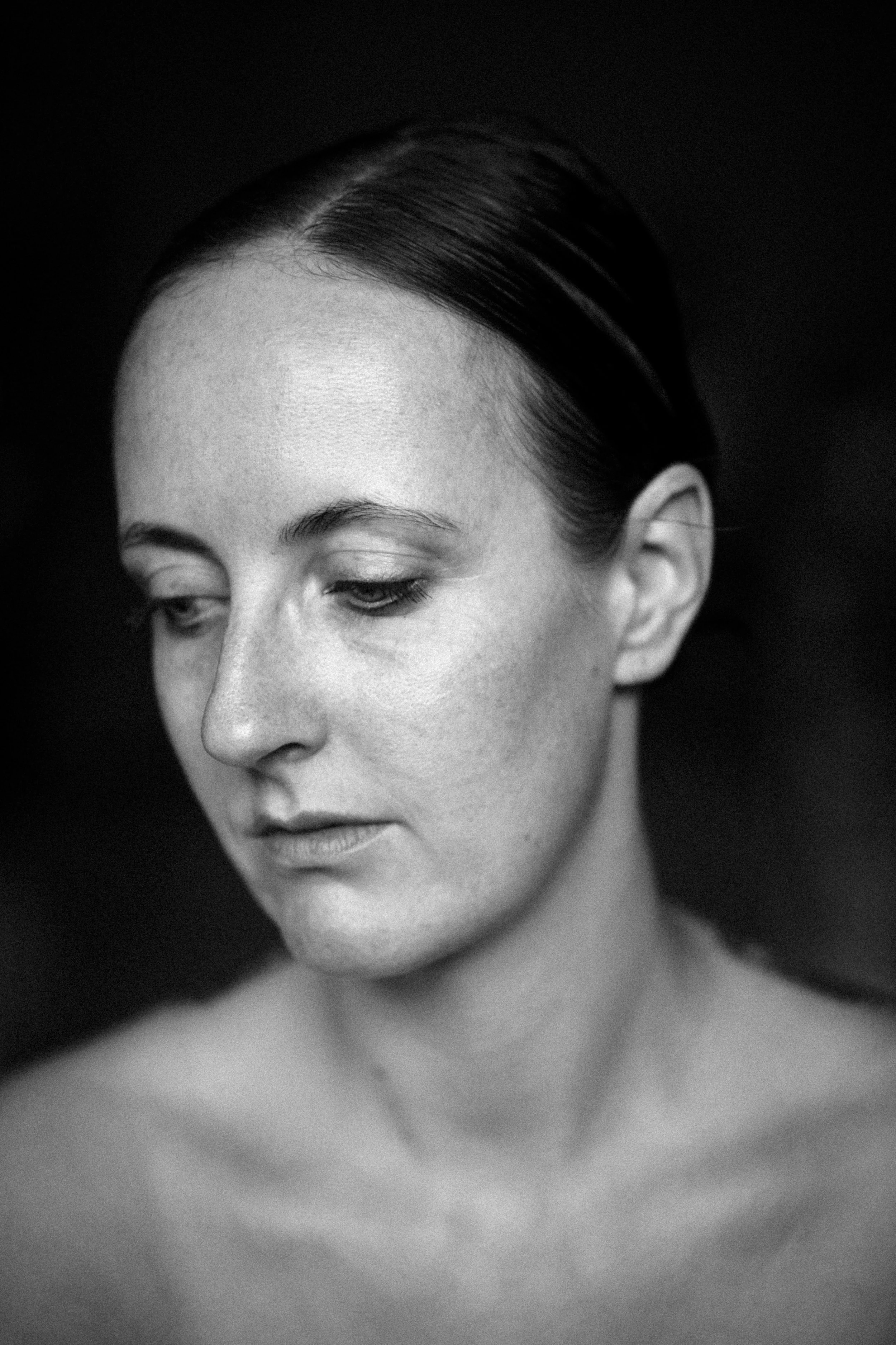 Schwarz-weiß-Fotografie einer jungen Frau mit kurzen, unordentlichen Haaren, leicht nach unten geneigtem Kopf, nur mit einer weißen Stoffbahn bedeckt, die sie teilweise über die Schulter gelegt hat. Sie steht vor einem dunklen, unscharfen Hintergrund