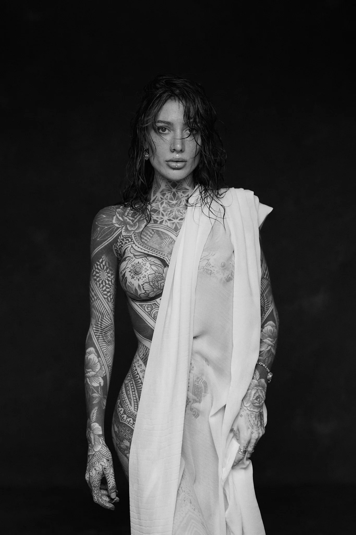Schwarz-weiß-Foto einer nassen, tätowierten Frau mit nassem Haar, die einen weißen Stoff trägt, vor dunklem Hintergrund.